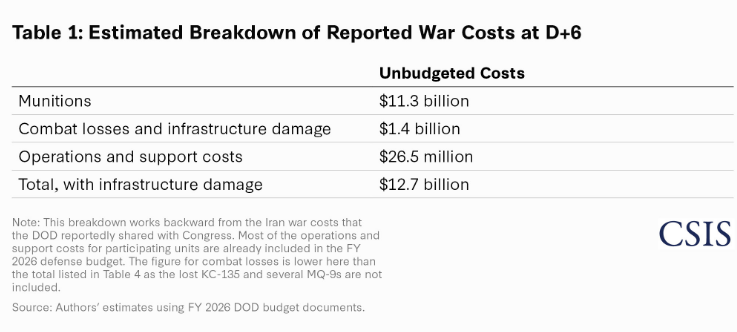 This update: (1) provides a plausible breakdown of the DOD’s $11.3 billion topline; (2) assesses the impact on munition inventories if the reported costs are accurate; (3) revises upward the estimated damage to U.S. bases in the region with available reporting and overhead photographs; and (4) estimates total war costs through the first 12 days using the latest DOD information.