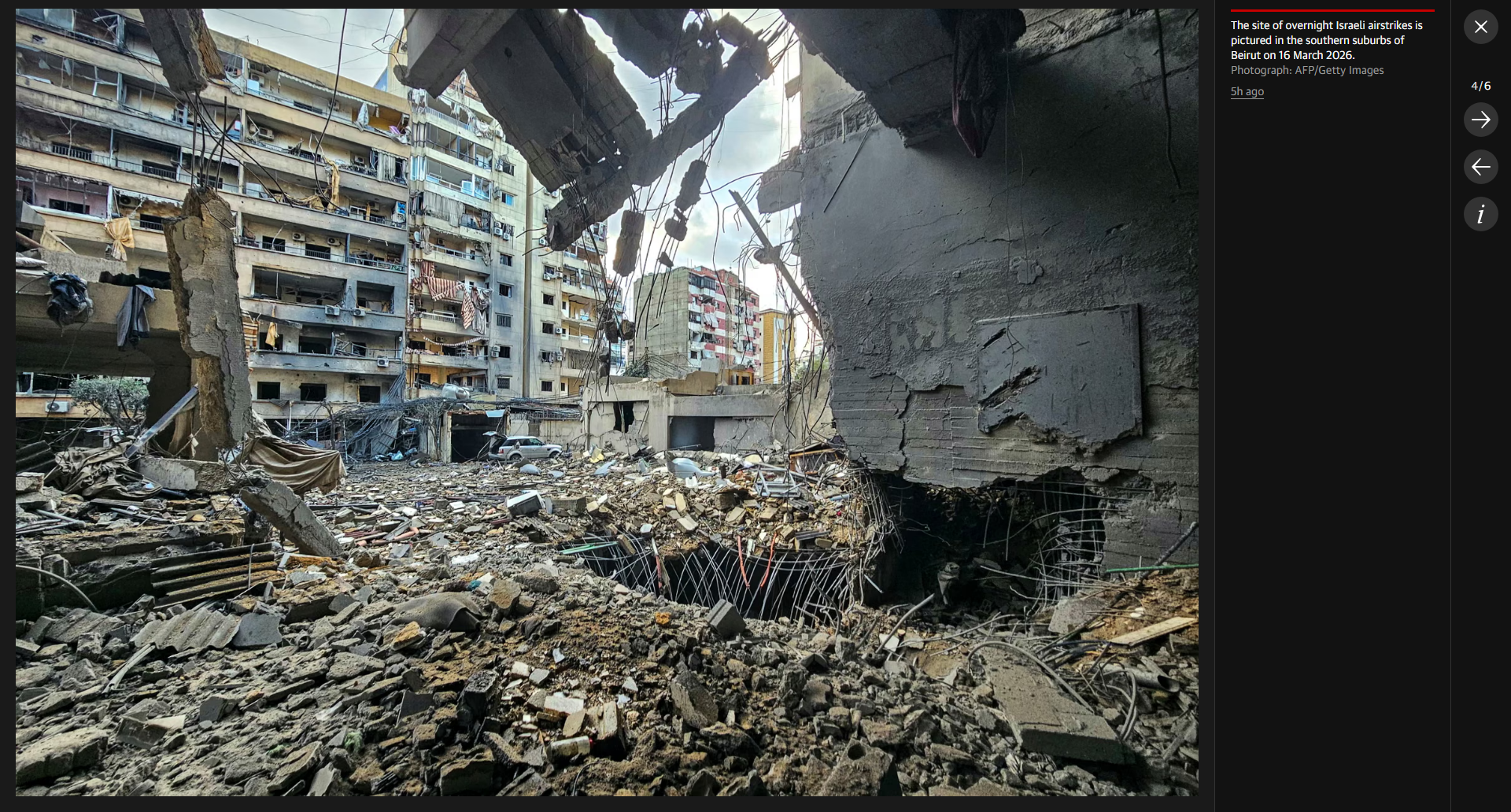 3월 15일까지 이란인은 1444명, 826명의 레바논 사람들이 사망했다. 세계 촛점이 호르무즈 해협에 가 있기 때문에, 레바논인들의참혹한 떼죽음은 가려지고 있다. 미국-이란 전쟁이자 이스라엘-레바논 전쟁이다. 1982년 이스라엘이 당시 PLO (팔레스타인 해방기구) 기지들을 파괴하기 위해 레바논 베이루트를 침략한 이후, 최악의 참상이 레바논에서 벌어지고 있다.