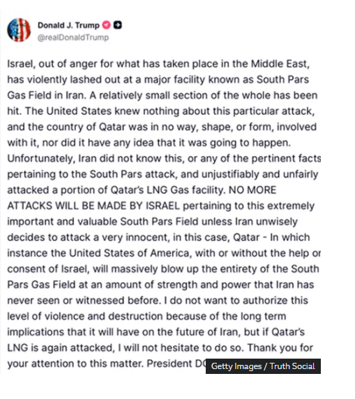 "NO MORE ATTACKS WILL BE MADE BY ISRAEL pertaining to this extremely important and valuable South Pars Field," he writes, "unless Iran unwisely decides to attack a very innocent, in this case Qatar."