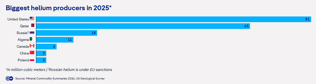 헬륨 매장량은 카타르가 1위이지만, 고갈성 천연자원 (헬륨)의 생산량의 1위는 미국이다.