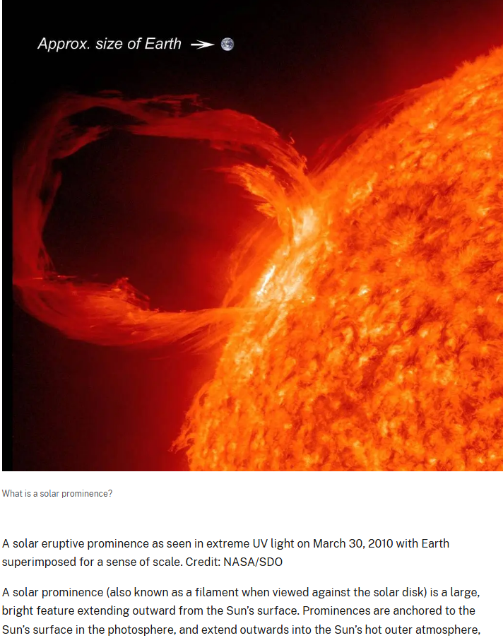 태양의 대기 층인 채층(Chromosphere)에서 수만 킬로미터 높이로 솟구치는 거대한 가스 기둥을 가리킴.