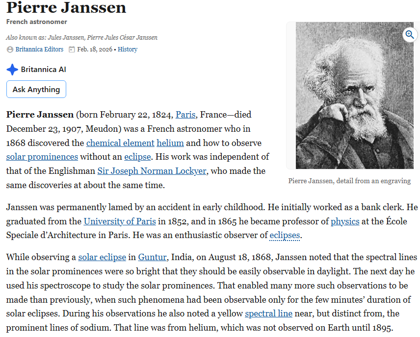 피에르 장센이 1868년 인도에서 개기일식을 관측하던 중 태양의 스펙트럼에서 이전에 보지 못한 밝은 노란색 선 발견.