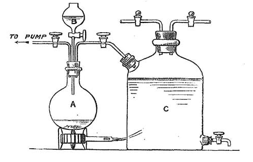 아래 그림에서, C 플라스크 안에서, 클레베이트 광물가루와 묽은 황산을 결합시키면, 여기서 발생한 가스가 관을 타고 A로 이동하고, 물을 거쳐, B로 간다.