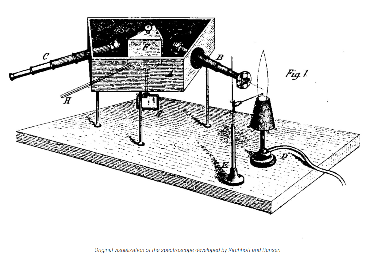 1859년 , 독일 하이델베르크, 화학자 로베르트 분젠(Robert Bunsen)과 물리학자 구스타프 키르히호프(Gustav Kirchhoff)의 협업