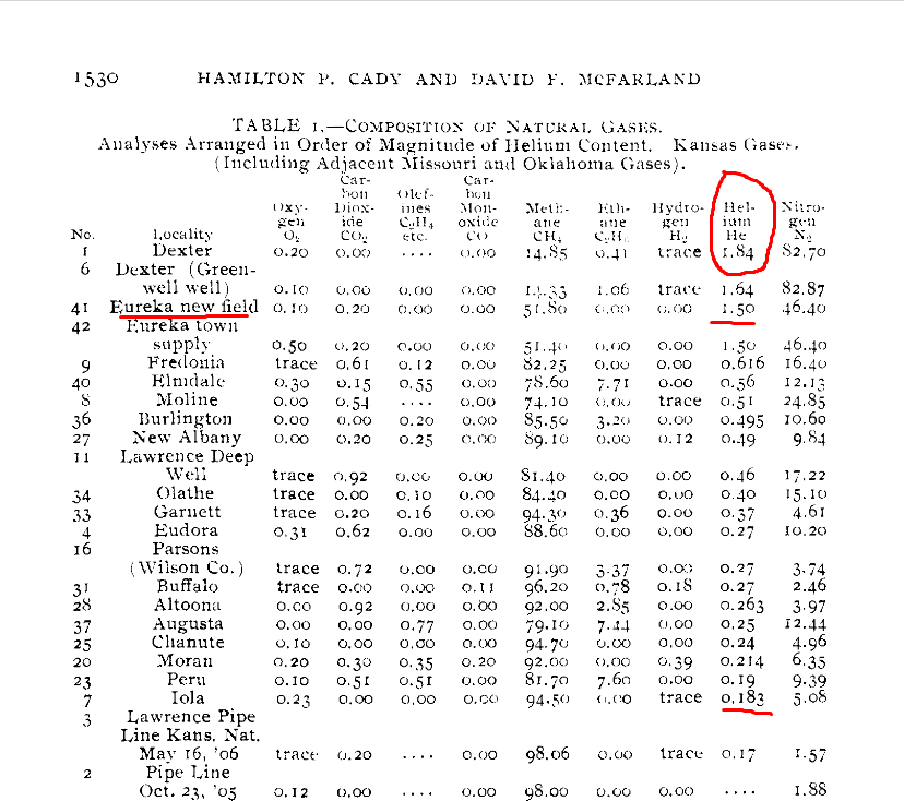 Hamilton Cady , David Mcfarland 해밀튼 케디와 데이비드 팩팔레인 논문. (천연가스에서 헬륨 발생과 천연가스의 구성)