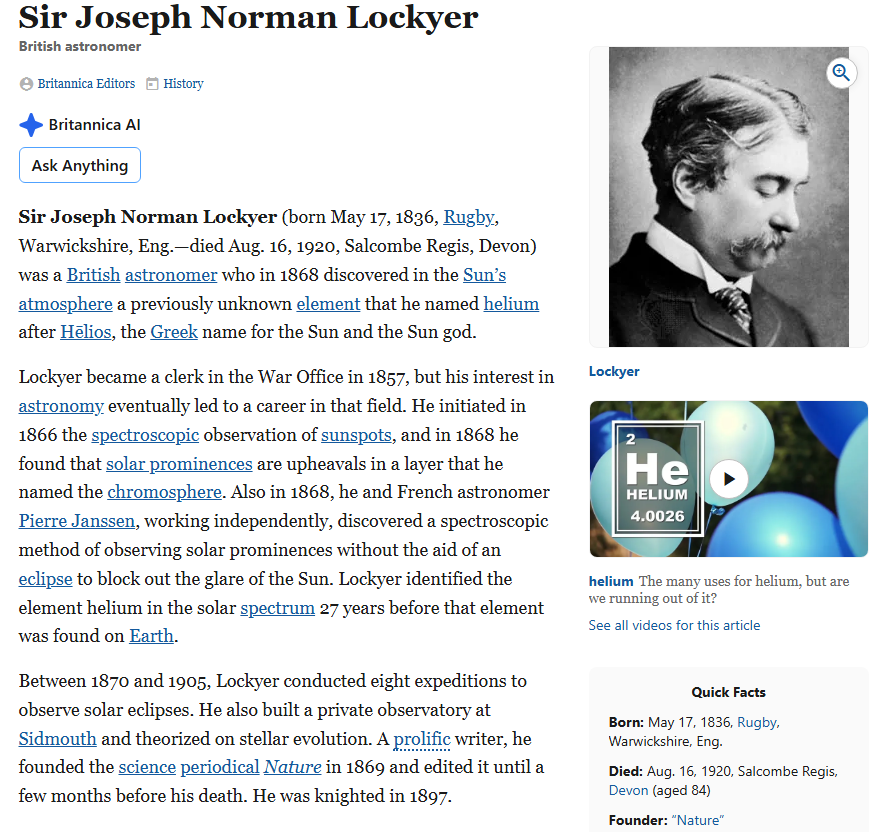 노먼 로키어 (1836-1920) 역시, 윌림엄 람지가 실제로 실험을 통해서 헬륨을 발견하기 27년 전에, 태양 관찰을 통해서 헬륨의 존재를 알아냄.