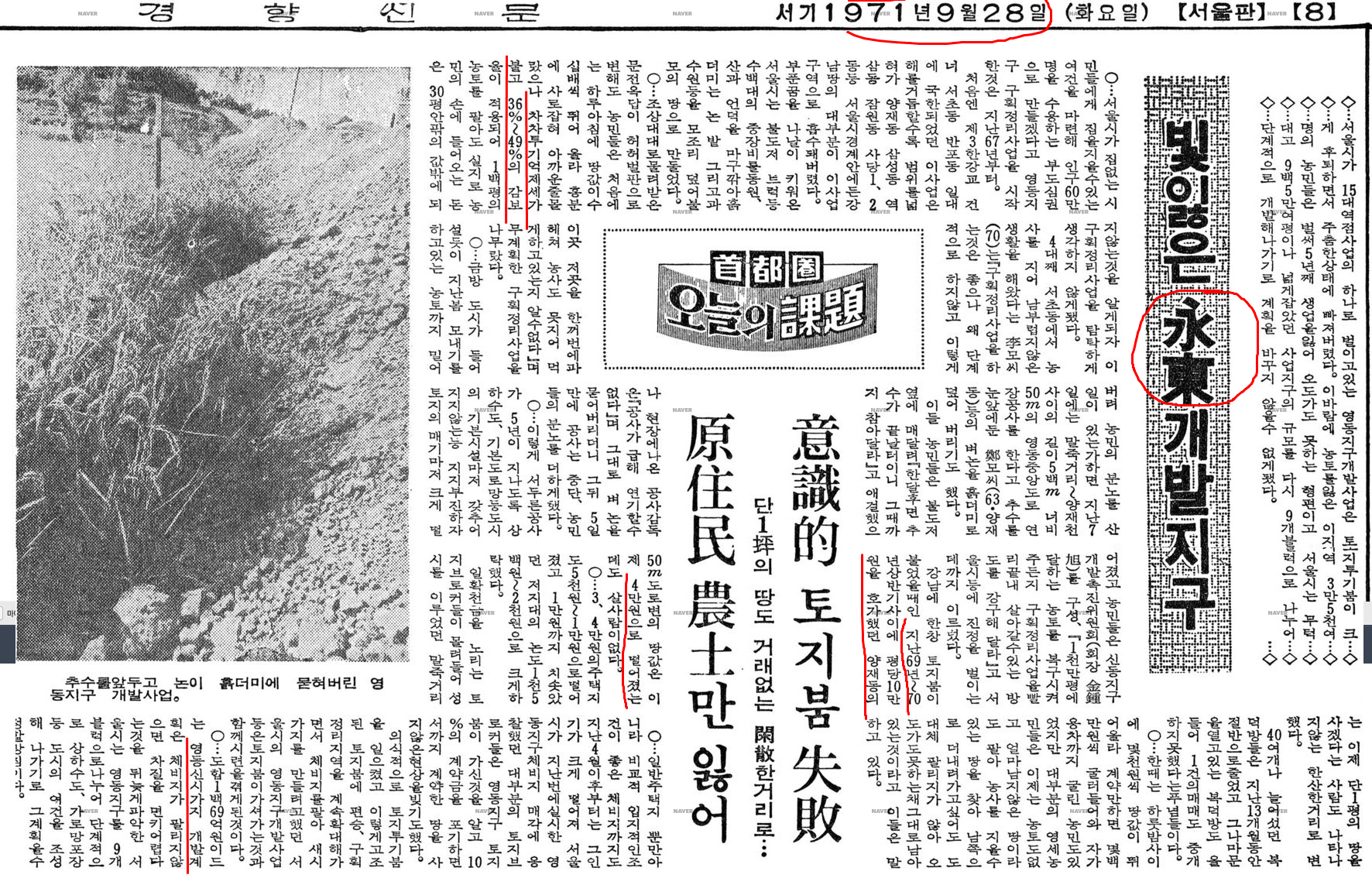 1971년 9월 28일 (빛을 잃은 영동-[강남] 개발) 경향신문을 보면,