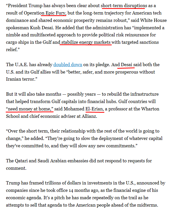 Mazarei has argued that many of the investment pledges Trump has secured from foreign governments aren’t realistic — particularly those from the Gulf. “I don’t think they will go back on their pledges,” he said. But now that Gulf leaders are staring at the costs of highly disruptive conflict, “those pledges are now becoming harder to deliver on.”