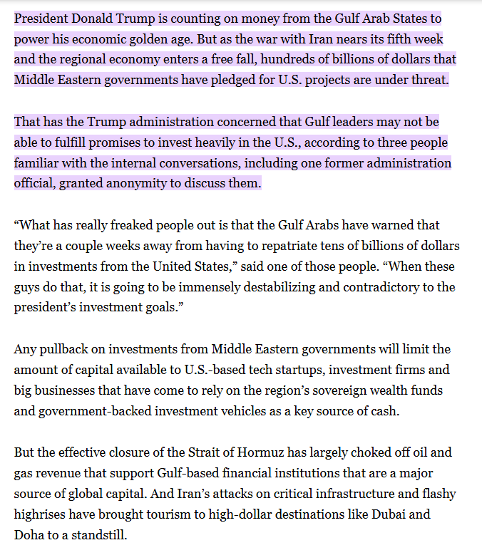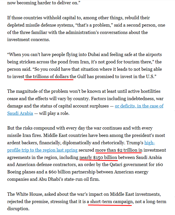 트럼프의 경제적 곤경. 1) 미국에 투자 약속 수조 달러, 아랍 국가들 (사우디,UAE, 카타르 등) 전쟁 피해로, 미국 투자 힘들거나 연기