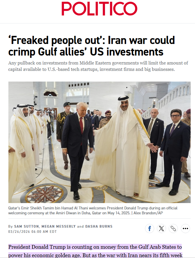 President Donald Trump is counting on money from the Gulf Arab States to power his economic golden age. But as the war with Iran nears its fifth week and the regional economy enters a free fall, hundreds of billions of dollars that Middle Eastern governments have pledged for U.S. projects are under threat.
