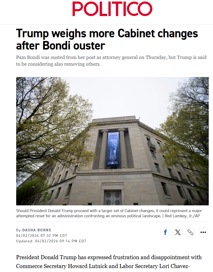 트럼프, 이란 전쟁으로 인기 하락. 엡스틴 (Epstein) 파일 문제로, 팜 본디 검찰총장 해임 등, 장관들 교체 예정.