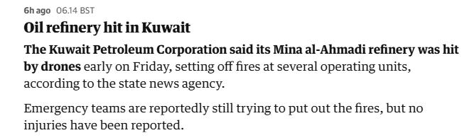 Kuwait and other Gulf nations have been bearing the brunt of Iranian strikes since war erupted on 28 February. Iranian drones struck Kuwait’s Mina al-Ahmadi oil refinery earlier today, sparking fires at the facility. In Bahrain, the country’s interior ministry reported sirens sounding overnight as it told people to head “to the nearest safe place”.