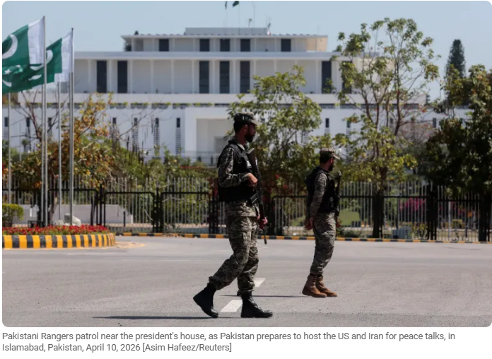 Pakistani Rangers patrol near the president's house, as Pakistan prepares to host the US and Iran for peace talks, in Islamabad, Pakistan, April 10, 2026 [Asim Hafeez/Reuters]