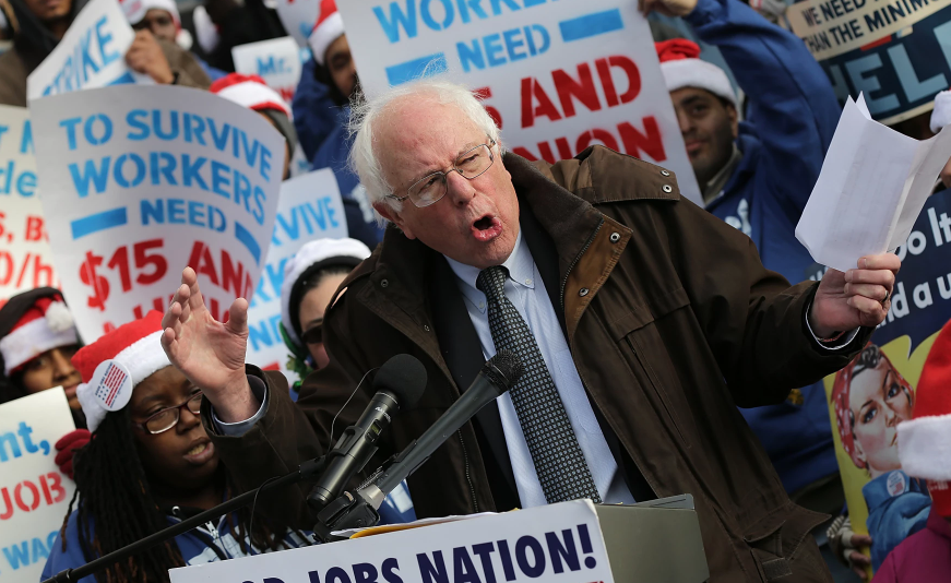 최저임금은 시간당 7.25 달러에서 15달러(한화 1만 8천원)로 인상되어야 한다. 샌더스는 주 40시간 노동하는 모든 미국인들은 빈곤선에 밑으로 추락해서는 안 된다고 주장한다. 하지만 민주당과 공화당 양당의 경제전문가들은 샌더스 말대로 최저임금을 급격하게 대폭 인상해버린다면 재정 적자인 도시들과 침체된 기업들은 의도치 않은 나쁜 결과에 직면할 가능성을 우려하고 있다.
