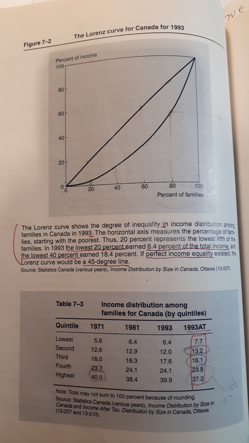 최근 스웨덴의 통계자료를 보면, 개인 수입(Personal Income)차이가, 상위와 하위가 2.5배 정도라고 한다. 1993년 캐나다의 로렌쯔 곡선을 보니까, 가장 못사는 하위 20%가 캐나다 전인구의 총수입액의 6.4%를 차지했다. 그리고 하위 40%까지 합산하면, 총수입액의 18.4%였다. 로렌쯔 곡선에서 완전 평등은, 하위 20%가 총 수입액의 20%를 차지하는 가족대비 수입 곡선에서 45도를 이뤄야 한다.