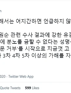 전 법무 장관과 법대교수는 법을 공부해서 '법망'을 빠져나가는 비법을 대중들에게 알리고 있고, 역사학자는 인류역사에서 사실을 왜곡하고, 거짓말로 승리한 지배계급의 '달콤한' 입술과 혀로 진실을 은폐하는 트위터,페북만 하고 있다. 역사학자라고 하는 전우용씨는, 권인숙 의원이 민주당 소속인가, 정의당 소속인가 아닌가, 2020년 4월 총선 결과라는 '역사적 사실'쯤은 공부를 하고 나서 정의당을 비난하던가, 정치평론을 해야 한다. 역사학자 전우용은 왜 피해자가 고통을 호소하고 있는지, 한번쯤은 생각해봤으면 한다. 박원순 사건의 결과는 비극이었지만, 이 시대를 사는 사람들에게 그것이 시사해주는 정치적 교훈, 직장 내 여성 인권 문제를 다시금 뒤돌아보게 만들었다는 점을 전우용은 다 부정해버린다. 민주당 소속 권인..
