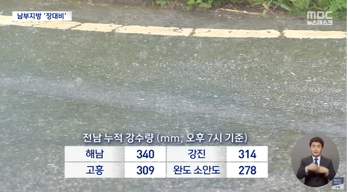 남부지방. 누적 강수량. 해남 340 mm, 고흥 309 mm, 강진 314 mm, 완도 278 mm.