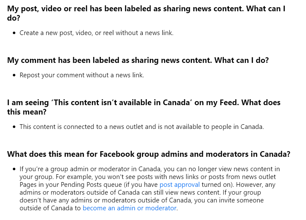 메타는 이 법안이 통과되기 전부터 수용할 수 없음을 분명히 했다. 법이 통과되면 캐나다에서 뉴스 공유를 금지시키겠다고 밝혀왔다. 메타는 공식 블로그에서 “온라인 뉴스법은 플랫폼이 작동하는 방식, 플랫폼을 사용하는 사람들의 선호도, 언론사에 제공하는 가치 등 현실을 무시한 근본적인 결함이 있는 법안”이라며 “캐나다에서 뉴스 콘텐츠 제공을 영구적으로 중단할 계획”이라고 밝혔다.