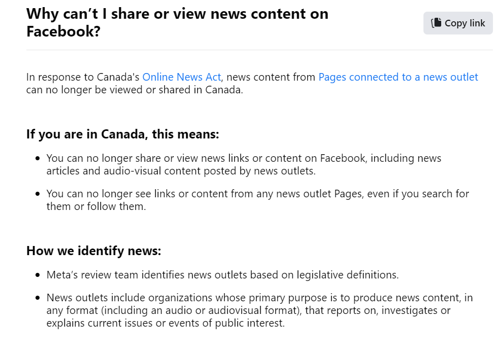 페이스북의 모회사 메타는 캐나다 사용자의 뉴스 콘텐츠 사용을 막겠다고 위협했다. 구글 역시 캐나다에서 뉴스링크의 사용을 제한할 수 있다고 반발했다. 이와 관련해 메타의 글로벌 분야 회장인 닉 클레그는 지난달 캐나다의 온라인뉴스법 추진과 관련해 “언론사는 뉴스 콘텐츠가 공유되는 것이 이익이라고 보기 때문에 그렇게 하지만, 우리에게는 결코 특별히 가치 있는 게 아니다”며 “웹페이지에 링크를 다는 것에 돈을 내라고 하면, 저작권 규범에도 맞지 않고 자유로운 정보 유통도 가로막게 된다”고 말했다.