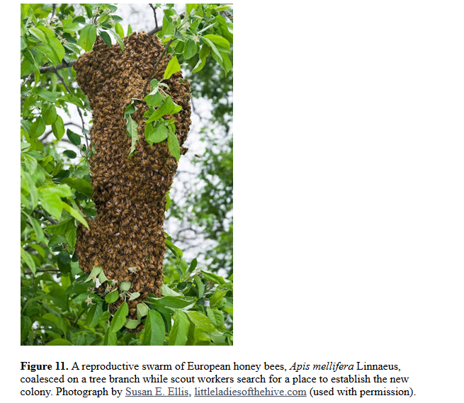 European honey bees typically swarm in the spring and early summer when pollen and nectar resources are plentiful. To initiate the swarming process, 10 to 20 daughter queens are produced by the colony. When the daughter queens are in the late pupal stage, the mother queen and about 2/3rds of the adult workers leave the colony and travel to a location where they will coalesce (Figure 11) while they send scout workers in search of a place to establish a new colony (typically an enclosed cavity, like a tree hollow).