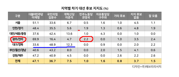진보정당, 민주노동당 5번 권영국, 여론조사. 광주 전라 2.2%, 대전충청 1%, 경기인천 1.9%, 서울 0.5%