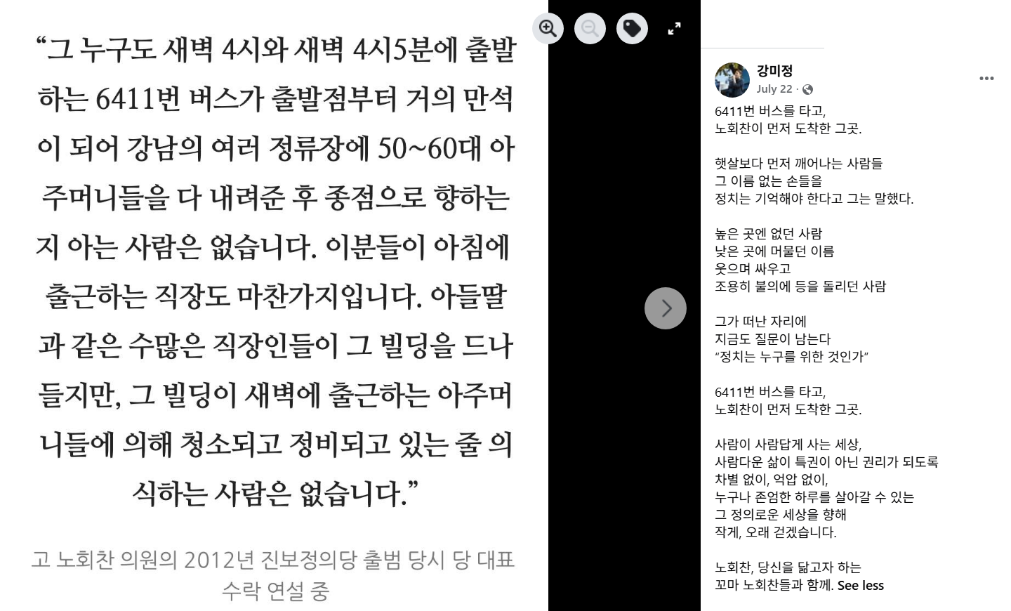 강미정 조국혁신당 대변인 "6411 버스를 타고, 노회찬이 먼저 도착한 그곳, 정치는 누굴 위한 것인가?"