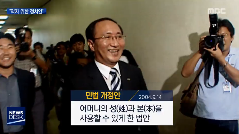 노회찬 의원은 국회 입성 직후 이름에 어머니 성도 쓸 수 있게 하는 '민법 개정안'을 처음으로 대표 발의했습니다.
