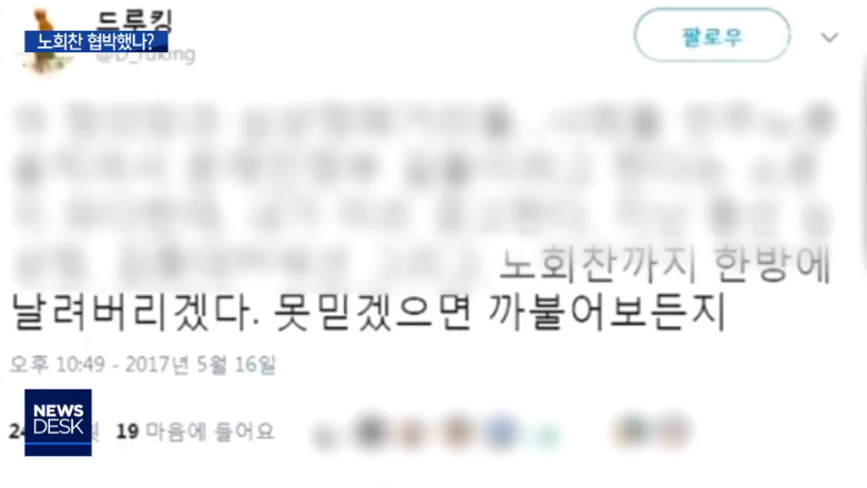 특검팀은 지난해 5월 드루킹이 SNS에 '노 의원과 정의당 인사들을 향해 협박성 메시지'를 올린 경위를 파악하겠다고 밝혔습니다.